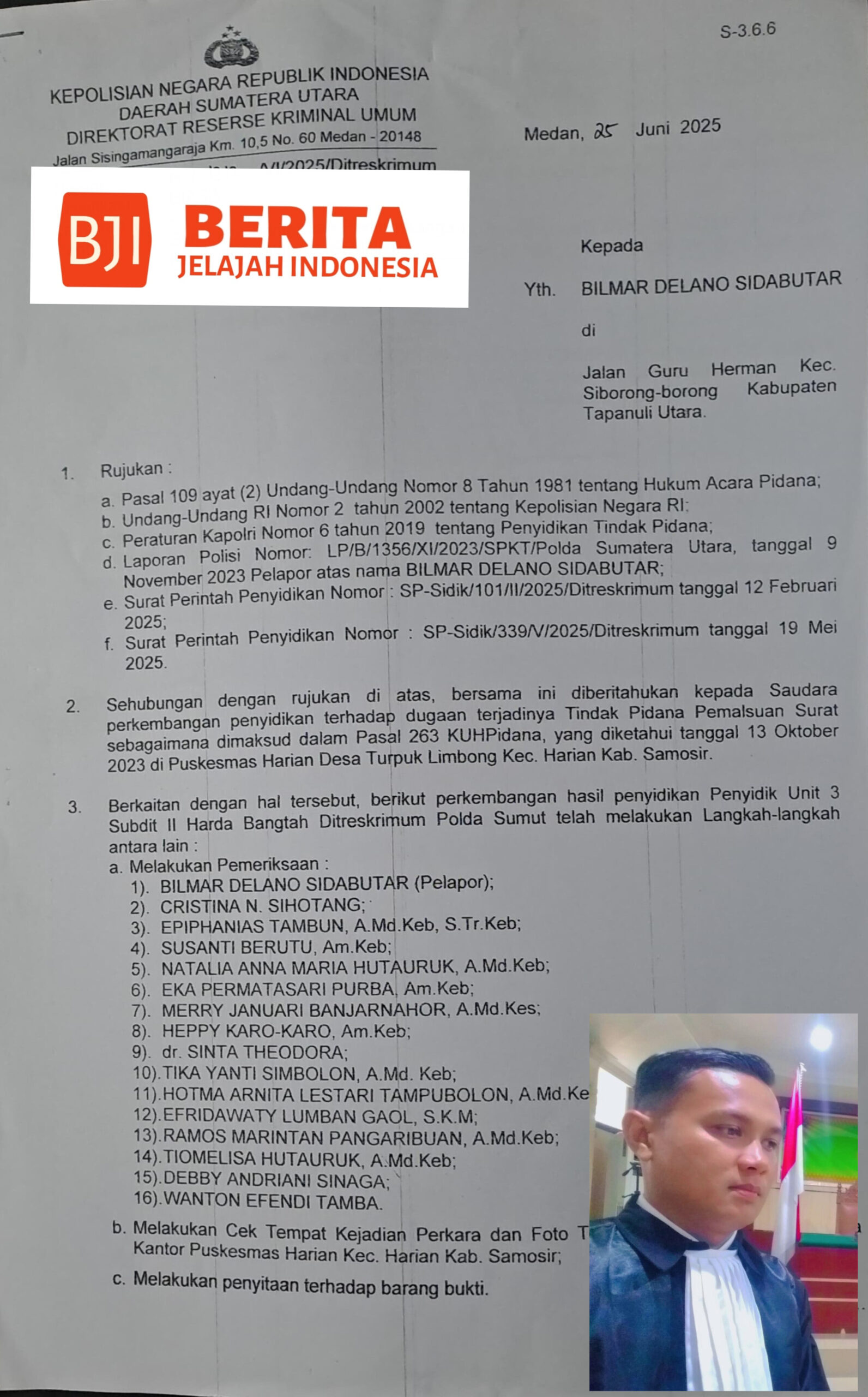 Sebagai pelapor dalam perkara dugaan pemalsuan tanda tangan dokumen CPNS di Kabupaten Samosir, klien kami, dr. Bilmar Delano Sidabutar, berhak penuh memperoleh informasi resmi terkait perkembangan proses penyidikan melalui SP2HP (Surat Pemberitahuan Perkembangan Hasil Penyidikan) sebagaimana diatur dalam Peraturan Kapolri Nomor 21 Tahun 2011 tentang SP2HP.