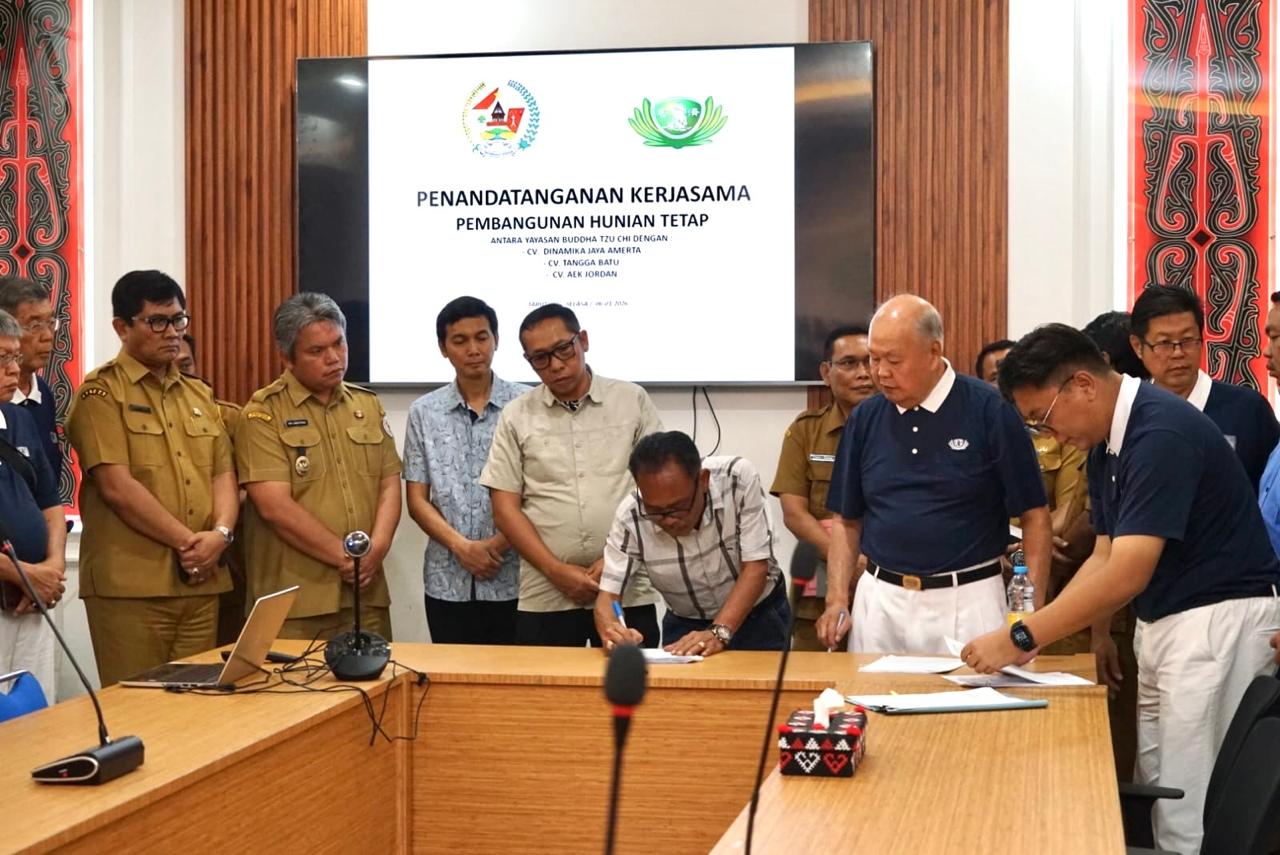 Taput, Beritajalajahindonesia.news||Pemerintah Kabupaten Tapanuli Utara terus menunjukkan komitmen dalam percepatan pemulihan pasca bencana. Bupati Tapanuli Utara Dr. Jonius Taripar Parsaoran Hutabarat, S.Si, M.Si bersama Wakil Bupati Dr. Deni Lumbantoruan, M.Eng dan Sekretaris Daerah Kabupaten Tapanuli Utara Drs. Henry Maraden Masista Sitompul, M.Si menyaksikan Penandatanganan Kerja Sama Pembangunan Hunian Tetap (Huntap) antara Yayasan Buddha Tzu Chi dengan 3 perusahaan pelaksana Pembangunan bertempat di Aula Mini Kantor Bupati Tapanuli Utara, Tarutung. (Selasa, 06 Januari 2026).
