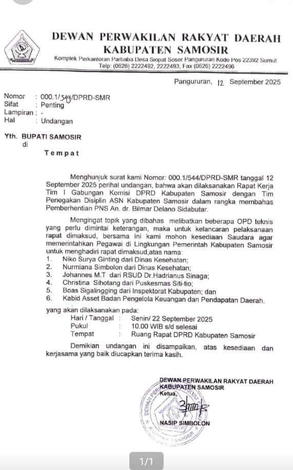 Surat undangan resmi DPRD Kabupaten Samosir tertanggal 12 September 2025 yang ditujukan kepada Bupati Samosir memuat permintaan agar sejumlah pejabat teknis hadir, antara lain pejabat Dinas Kesehatan, Direktur RSUD Dr. Hadrianus Sinaga, perwakilan Puskesmas Sitio-tio, Inspektorat, serta Badan Pengelola Keuangan dan Pendapatan Daerah. Mereka diminta hadir memberikan keterangan guna mendukung kelancaran rapat.